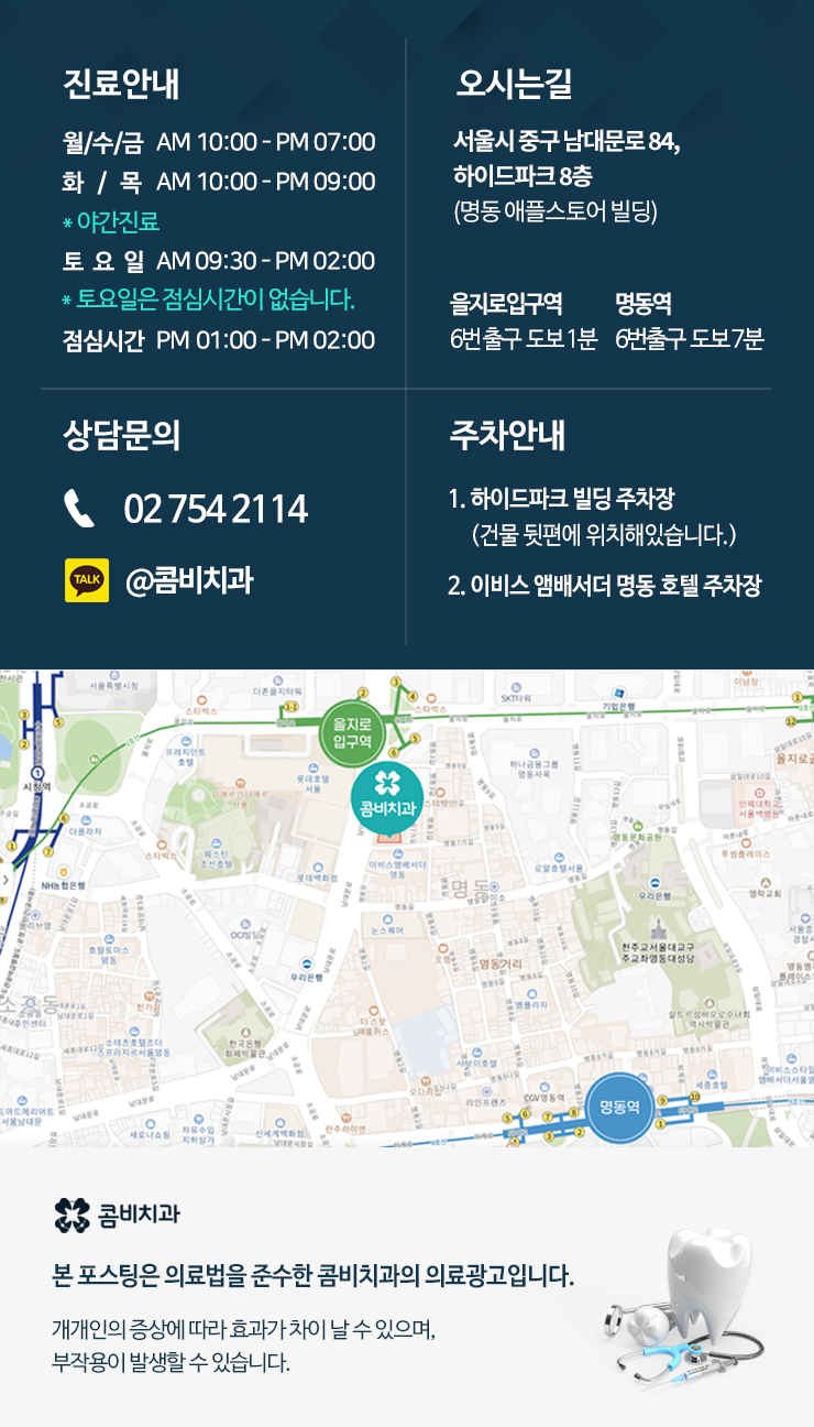 치과에는 치아가 아파야만 가시는 분들의 경우 치과 치료 후 별다른 문제가 없으면 아플때 까지 치과에 잘 안가시는 경우도 있는데요. 나이가 들수록 2차 충치나 치아 사이 충치, 사랑니 문제 등 눈에 잘 안띄고 증상 만으로는 뒤늦게 치료할 수 밖에 없는 치아 문제들이 종종 발생하기 때문에 자연치아의 건강을 지키기 위해서라도 주기적 검진은 필수적입니다.